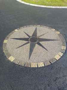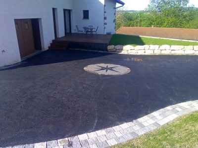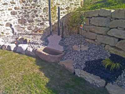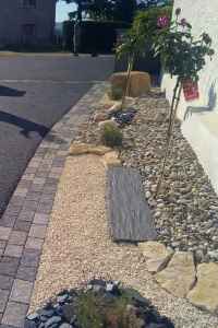 Aménagement d'une entrée avec muret de clôture en pierre naturelle et piliers de portails déco. Réalisation de l'enrobé de l'accès principale carrossable avec un motif de rose des vents. Pose d'un enrochement paysager de soutènement. Réalisation de massif déco minérales et végétales. Installation d'une terrasse en bois exotique Ipé.