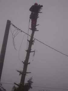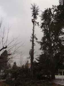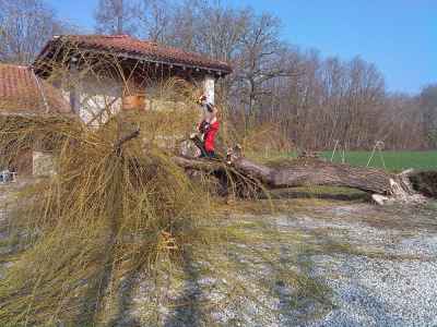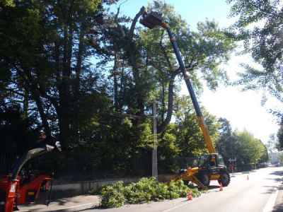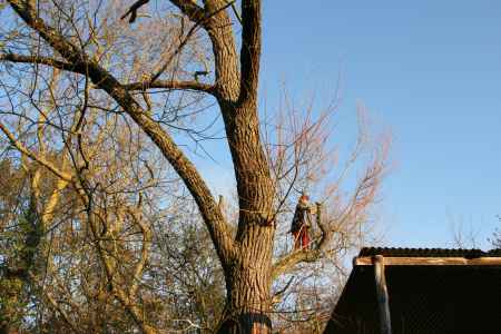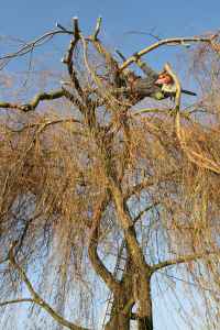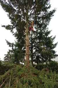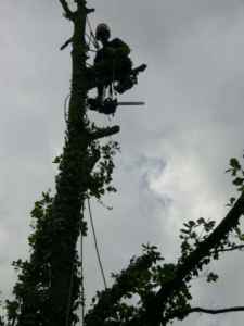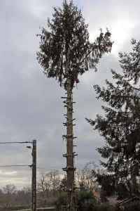 • Abattage indirect ou démontage : l’arbre est abattu par démontage en tronçons depuis la cime de l’arbre, si l’environnement proche de l’arbre comporte des obstacles (câbles électriques, maison, toiture, ...). Notre élagueur grimpe alors dans l’arbre à l'aide de cordes et de matériel de sécurité.