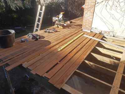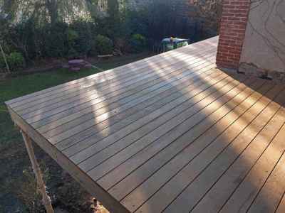Rénovation d'un balcon / terrasse suspendu en appui sur poteaux avec barrière en fer forgé. Rénovation complète de la structure en bois et réalisation d'un plancher bois avec un nouveau garde-corps dans le style ancien.