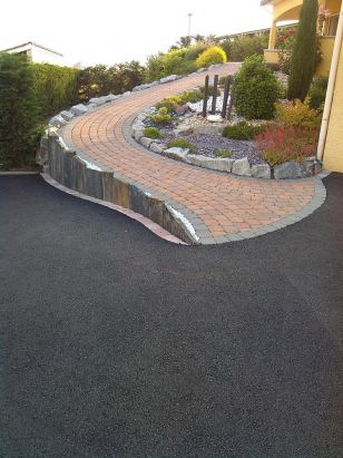 L'enrobé noir à chaud reste un classique pour aménager les accès de garage carrossable, les cours, ou l'allée piétonne pour accéder à la porte d'entrée de votre maison, en raison de son prix économique. L'inconvénient d'un revêtement en bitume étant d'être imperméable, notre équipe de paysagiste vous conseillera en amont, de raccorder des caniveaux et grilles au réseau d'évacuation des eaux de pluies. La mise en œuvre d'un enrobé noir à chaud nécessite également une délimitation par des bordures. L'enrobé s'associe esthétiquement avec des bordures en pavés qui permettent de créer des formes personnalisées ou l'insertion d'un motif, pour la création de votre accès principal par un paysagiste professionnel.