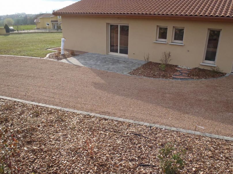 Allée en gravette ocre rouge rosé pour l'entrée de la maison et du garage